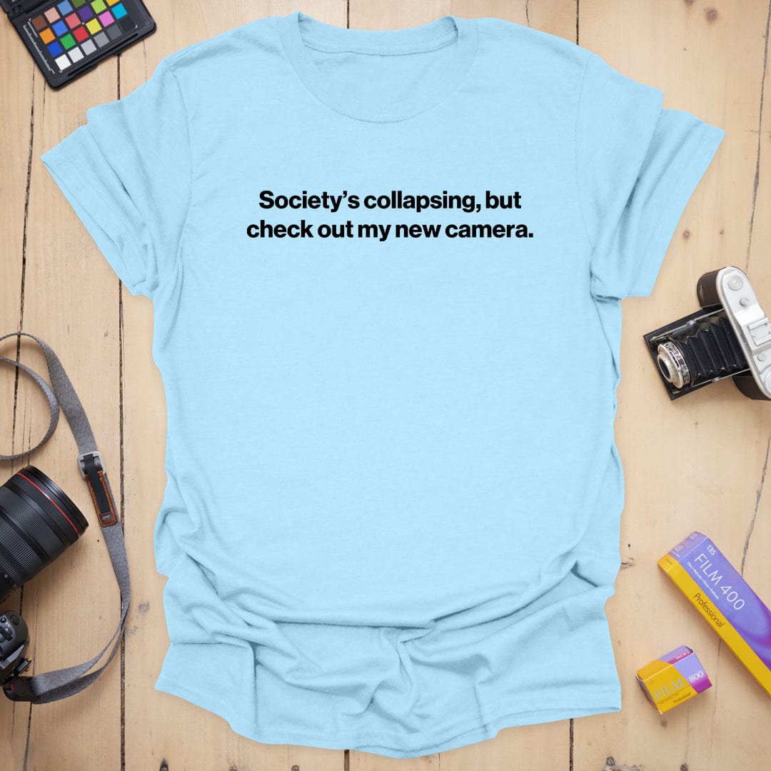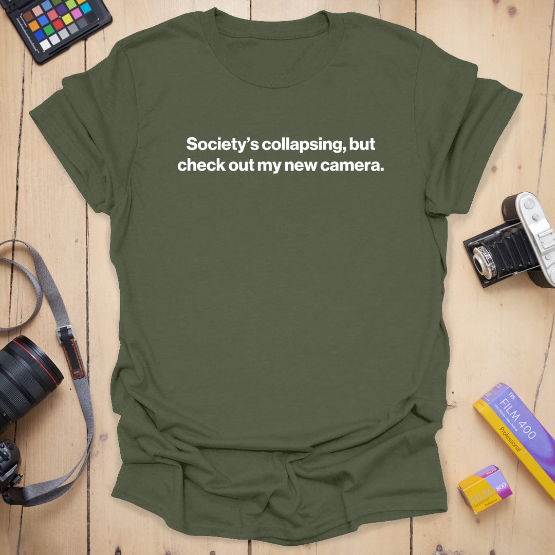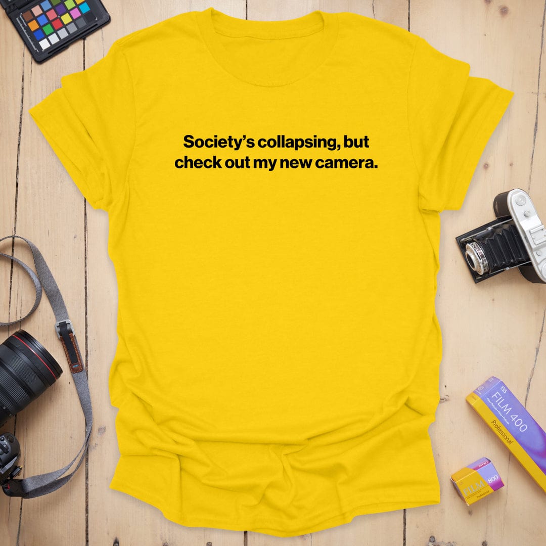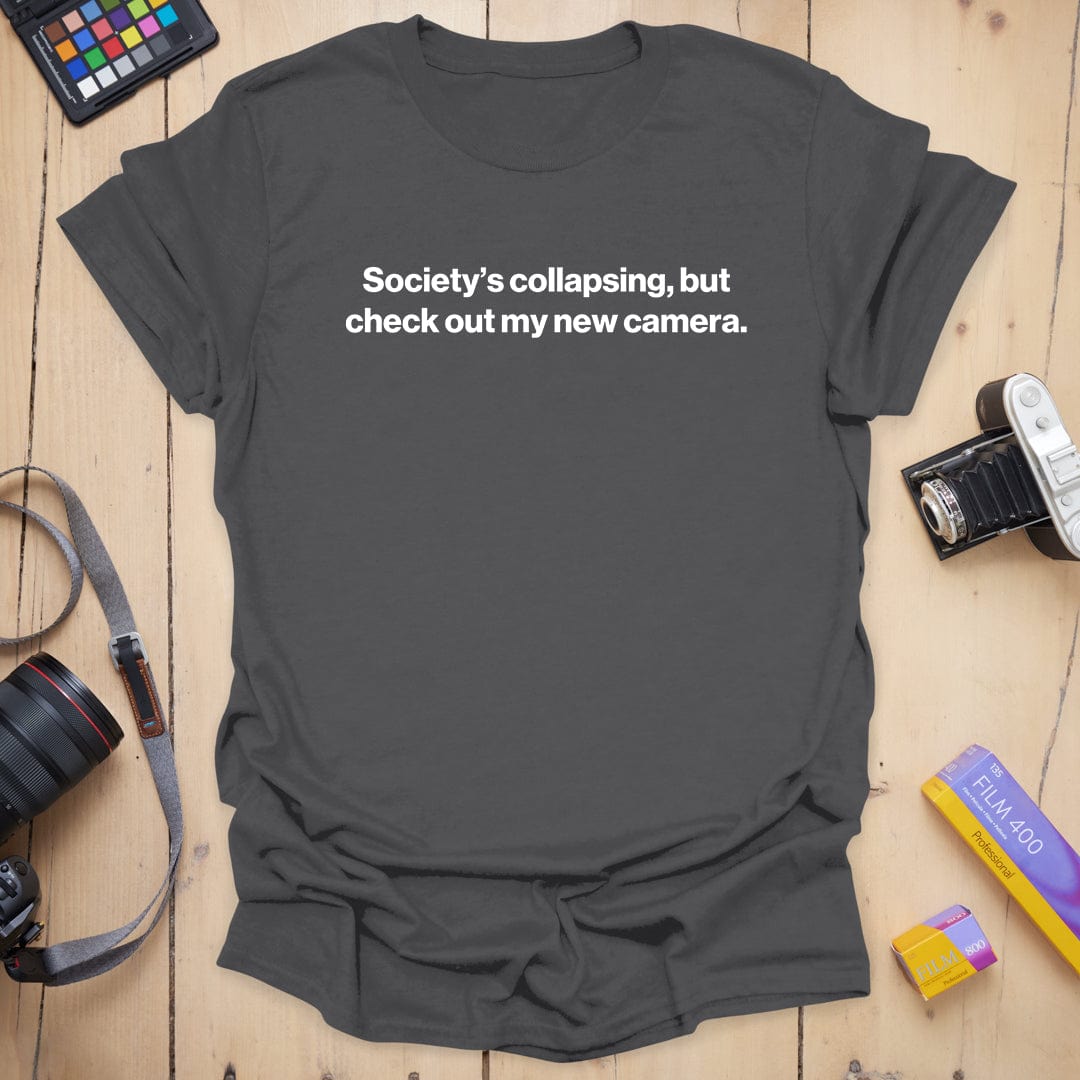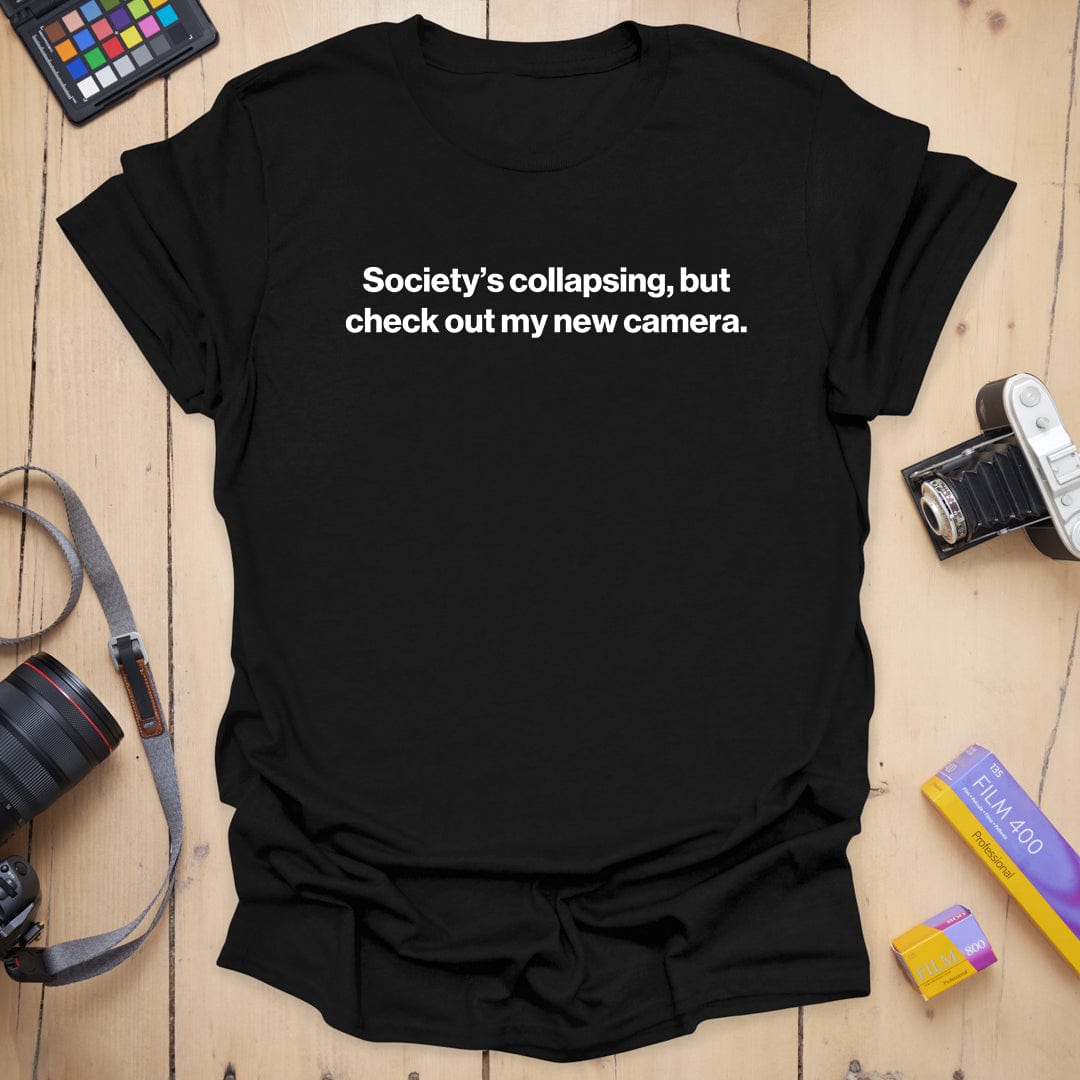 Dark humor meets camera gear obsession — our “Collapse” tee is for the shutterbugs who find solace in sharp focus and new toys, even as the world crumbles. Equal parts existential and enthusiastic, it's a vibe… and a coping mechanism. 📸😅
