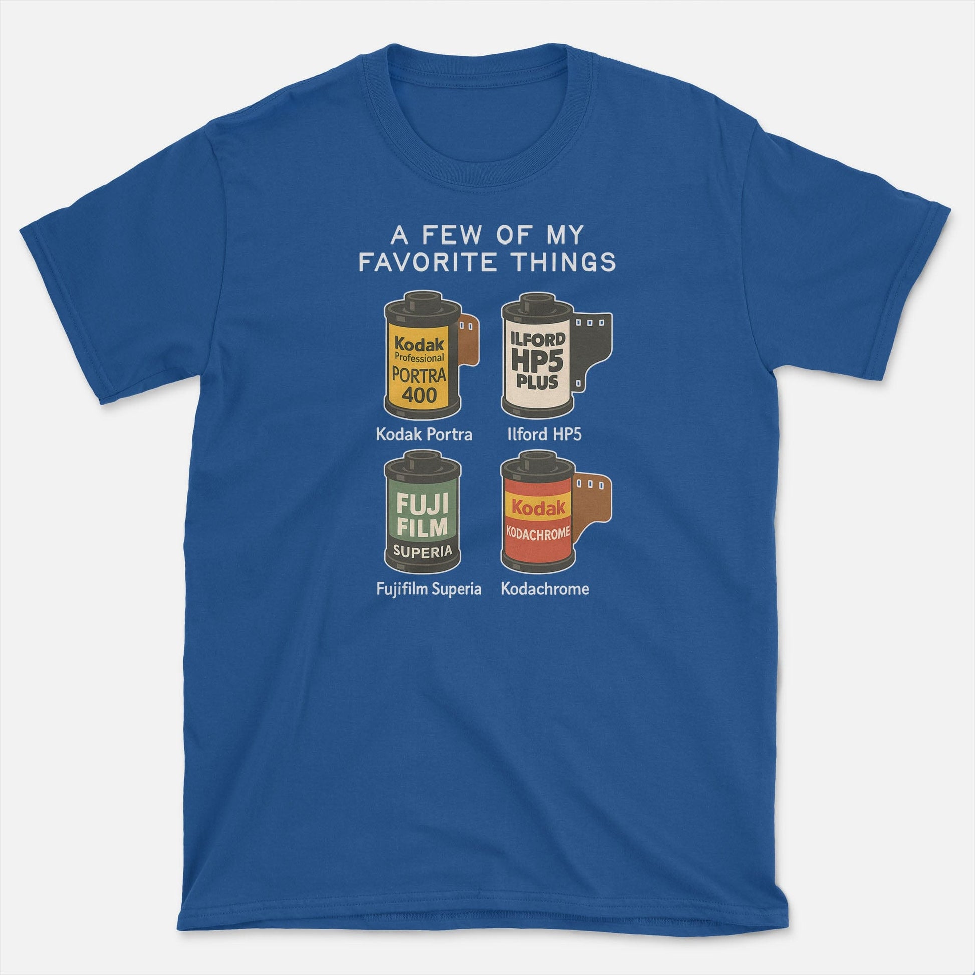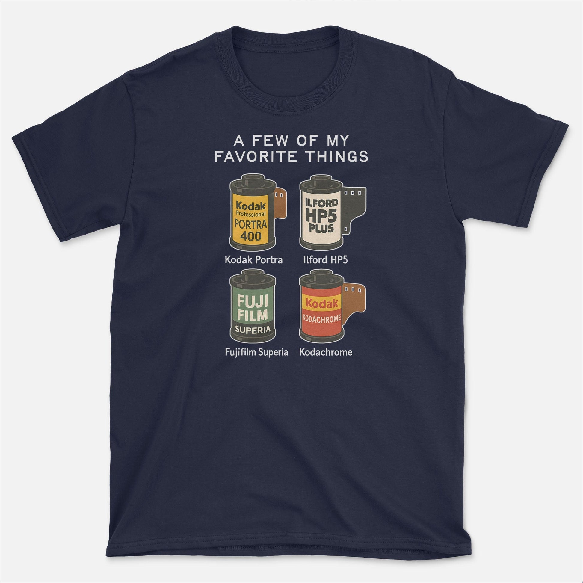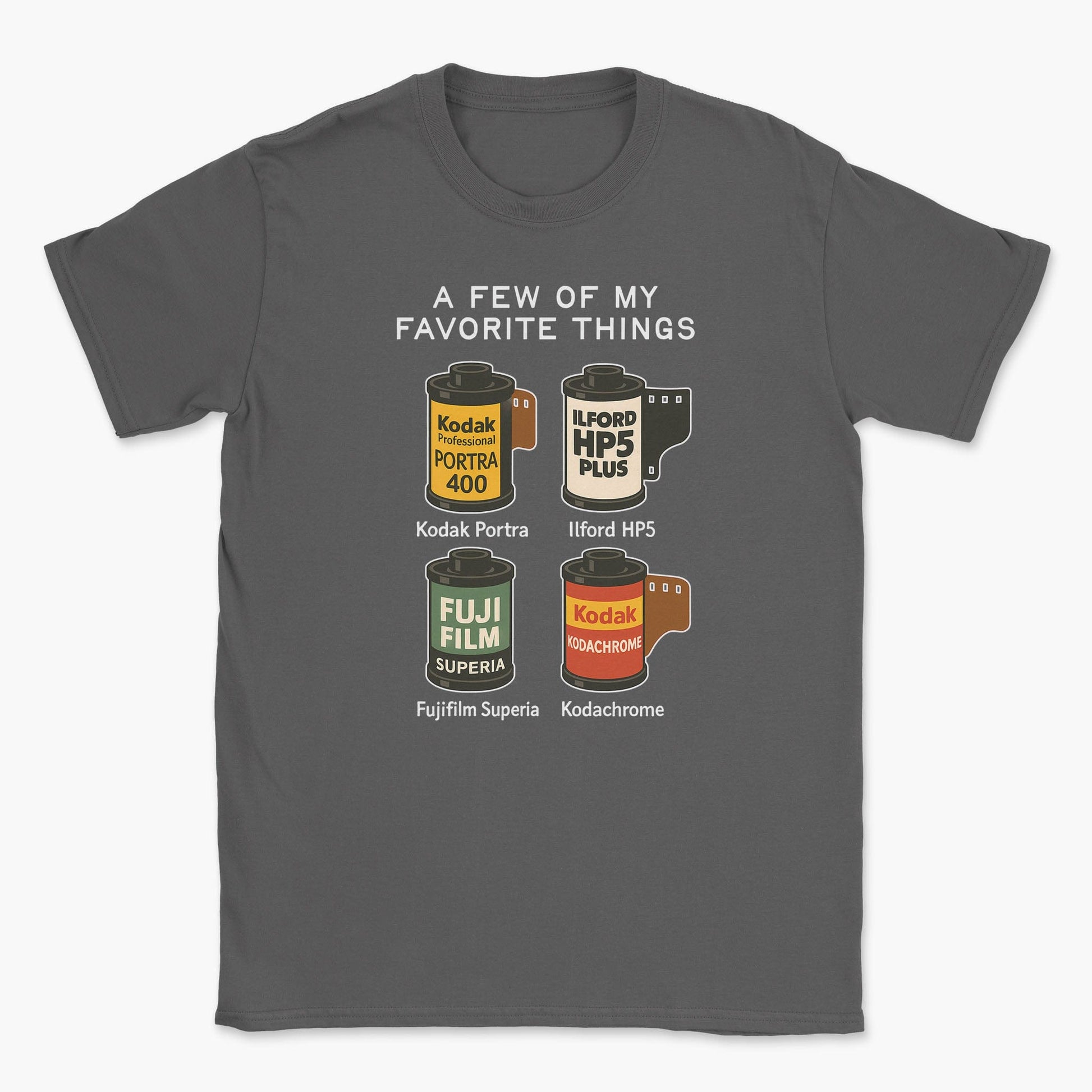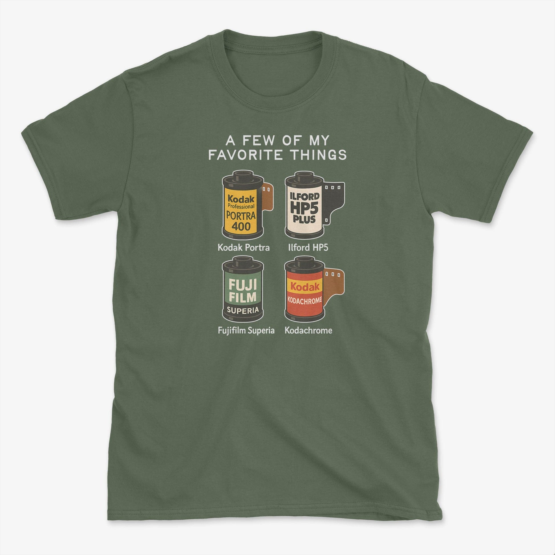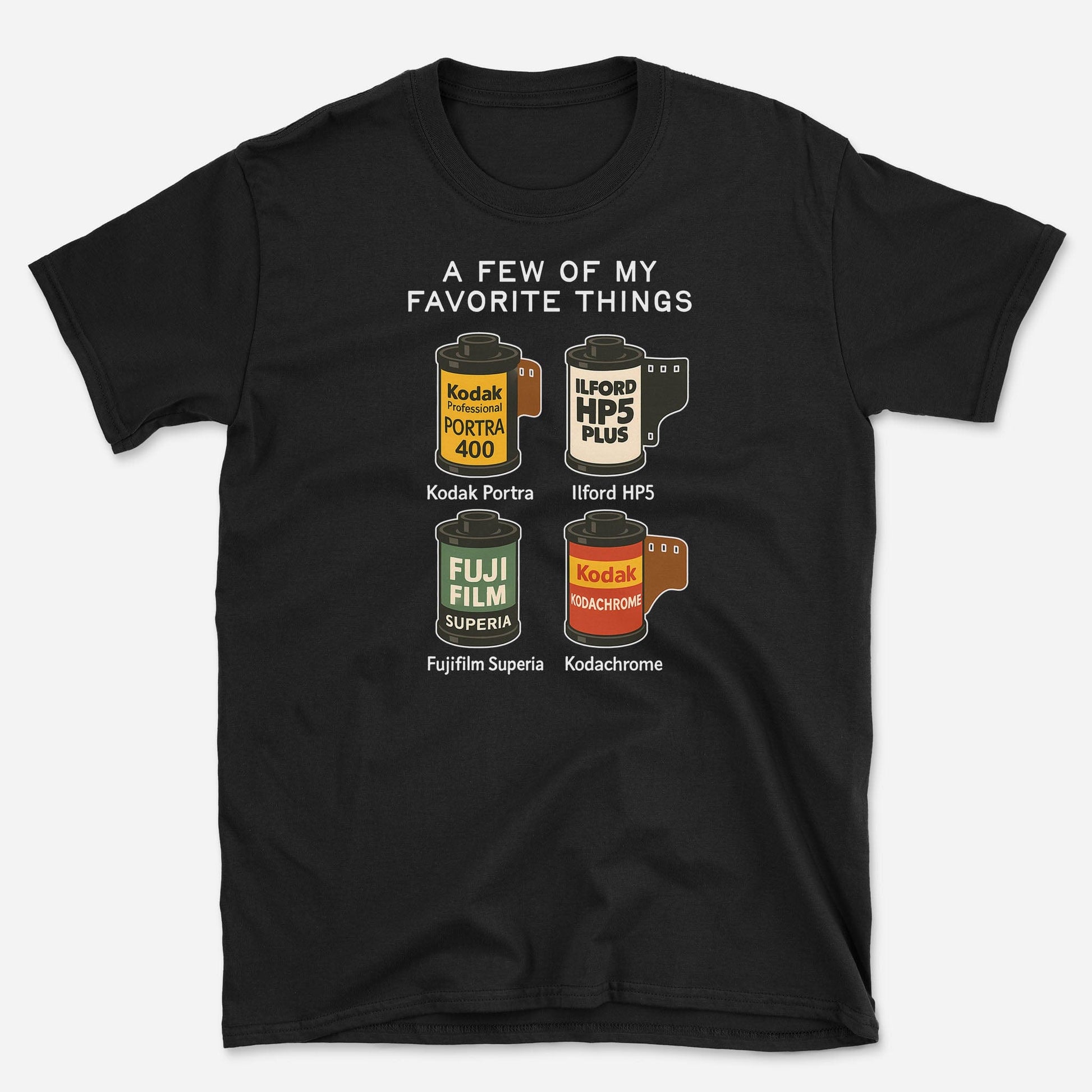 Got a soft spot for classic film stocks? Same. The "Favorite Things" tee celebrates the icons—Kodak Portra, Ilford HP5, Fujifilm Superia, and Kodachrome—all lovingly illustrated like the legends they are. It’s basically your film fridge... but wearable. 📸🎞️