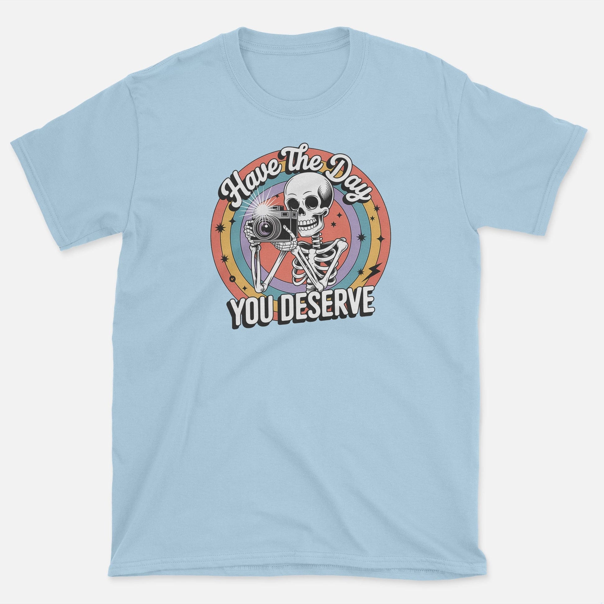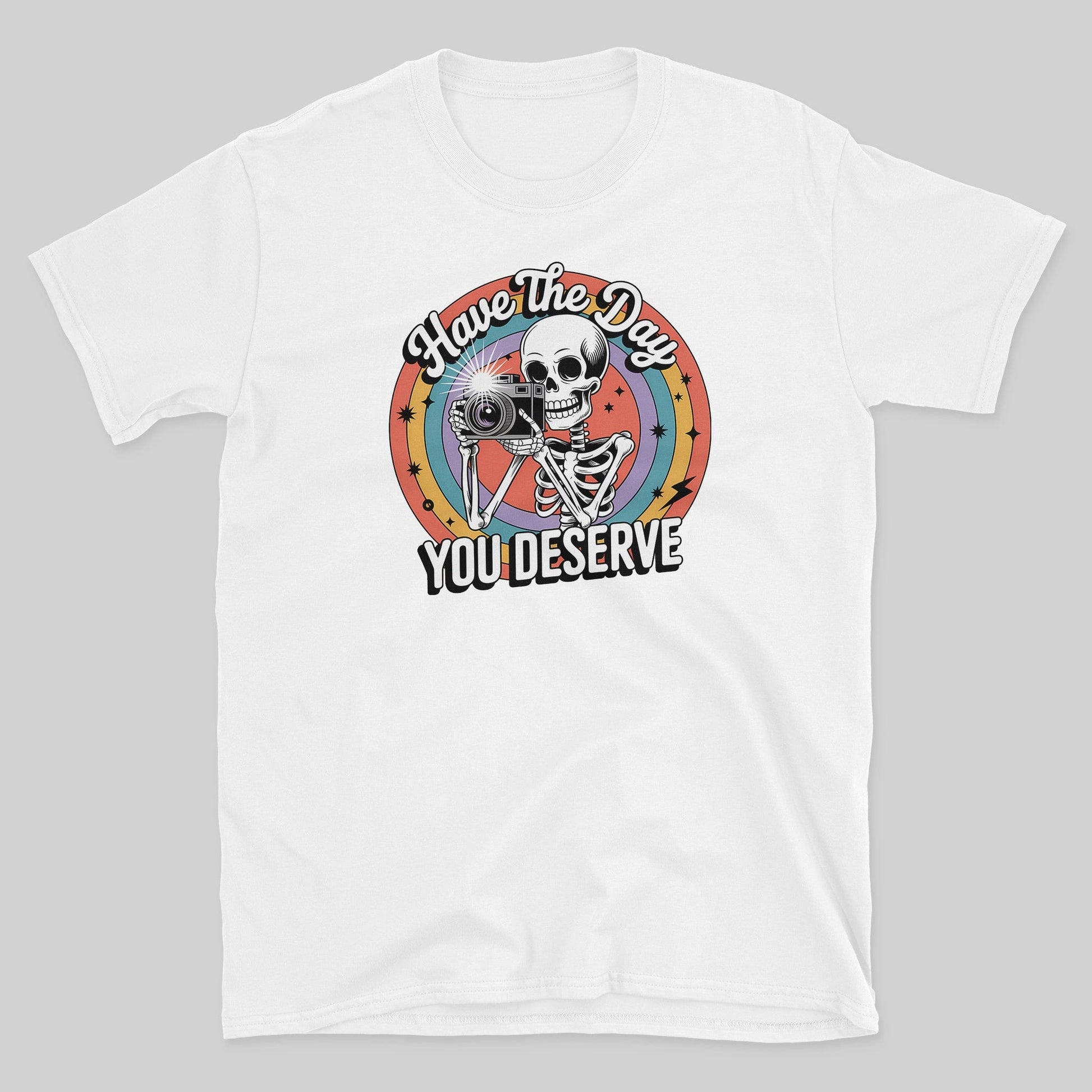 A little sass, a little snap — the Have the Day You Deserve T-Shirt says it all. Featuring a retro rainbow and a camera-wielding skeleton, it’s perfect for photographers who serve sarcasm with style. Smile… or don’t. ☠️