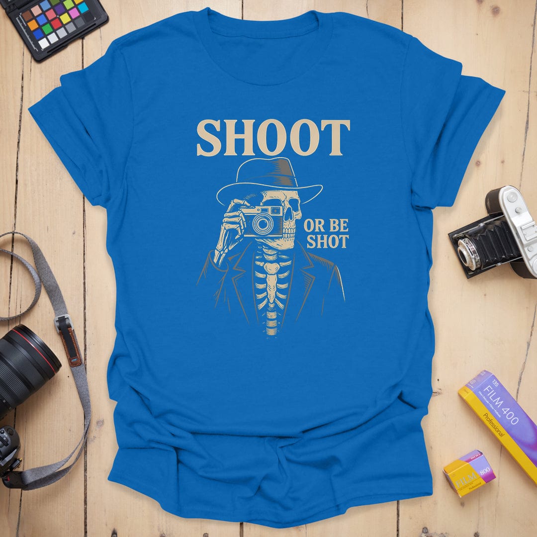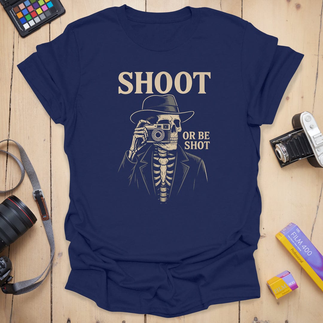 Darkroom drama meets street-style swagger—the *Shoot or Be Shot T-Shirt* is for the fearless photographers who live by the frame. Featuring a dapper skeleton with vintage gear and major noir energy, this tee says you're always ready to click before you get clicked. Stay sharp. Stay spooky. ☠️📸