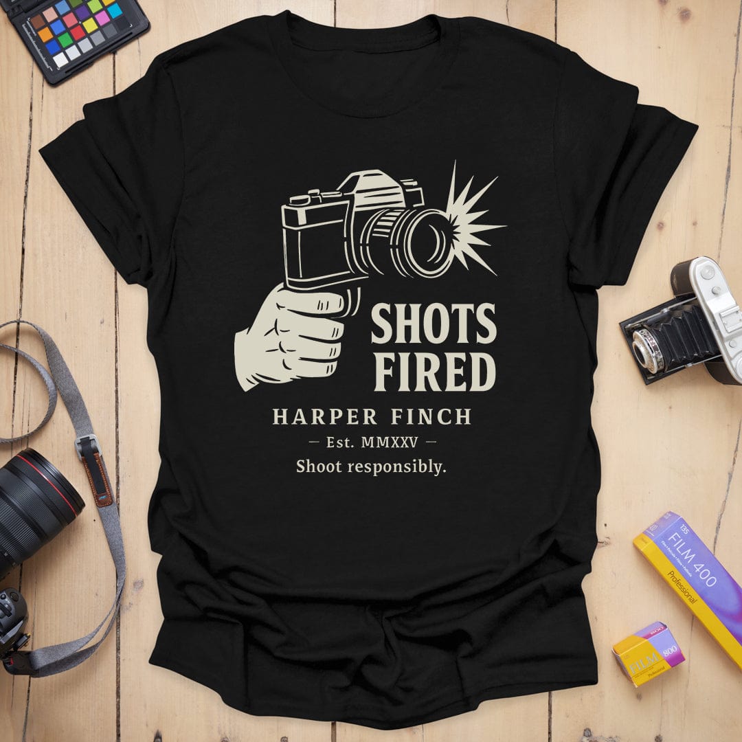 Shots Fired. This tee delivers bold style with a side of tongue-in-cheek photographer humor. Perfect for those who shoot first (with a lens, of course) and edit later. A Harper Finch original—shoot responsibly 📸💥