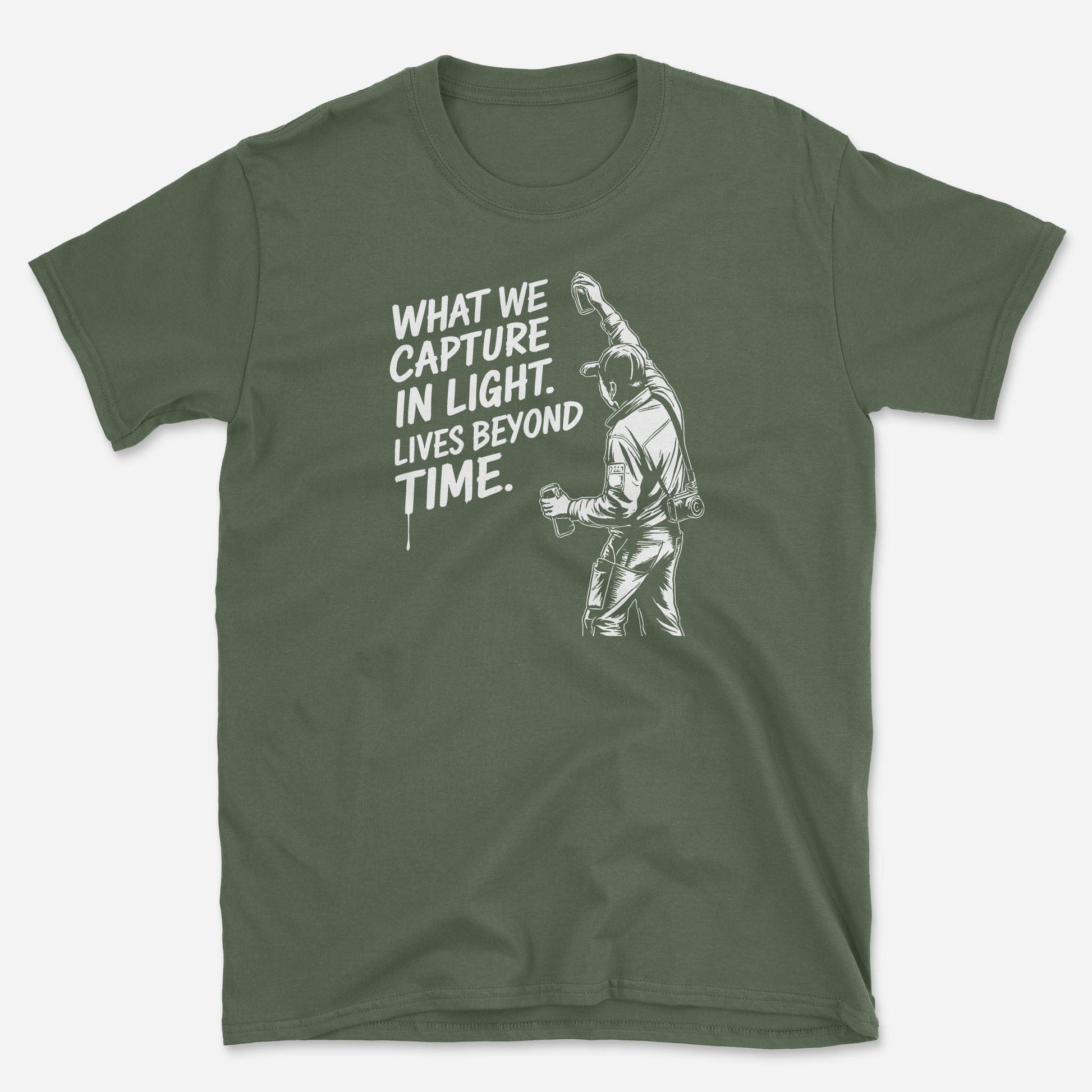 “What We Capture in Light” is a poetic nod to the soul of photography—where moments freeze, but meaning endures. With street art vibes and timeless wisdom, this tee is made for photographers who shoot with heart and see beyond the frame 🎞️✨